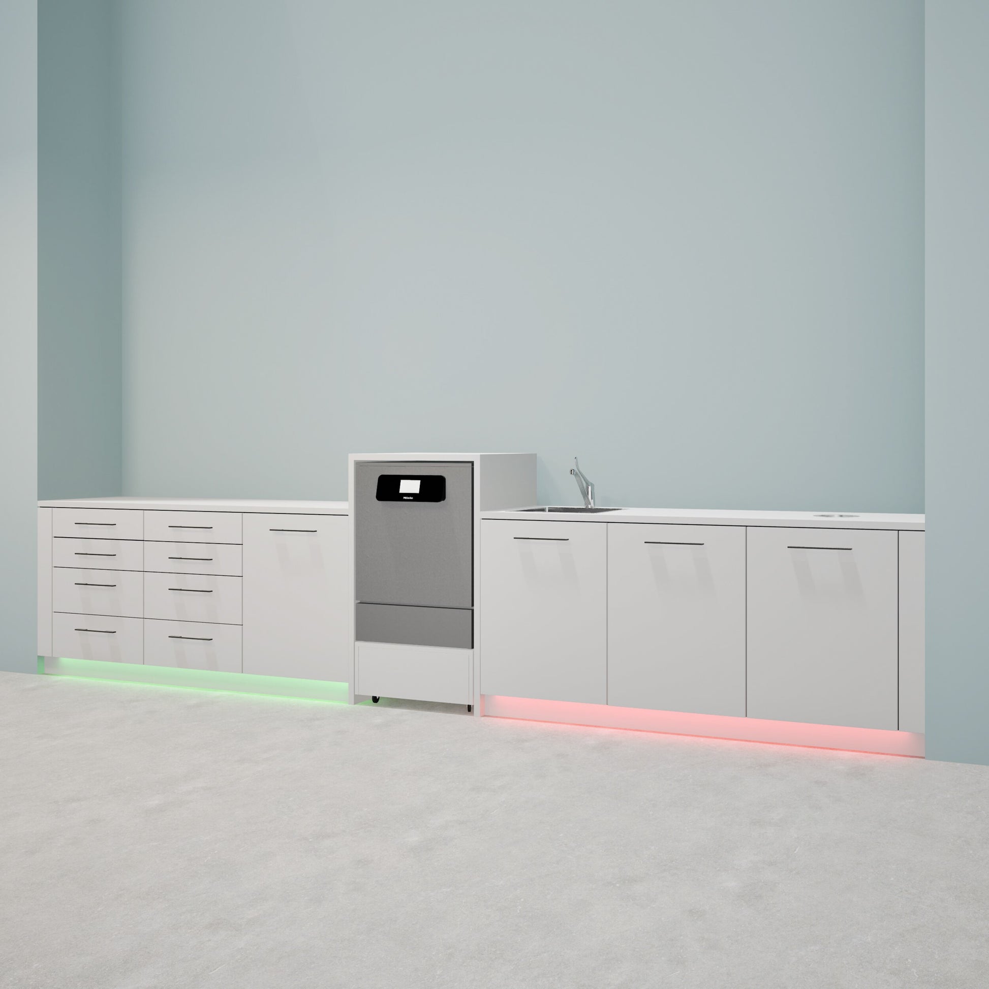 Dit sterilisatiemeubel is dé totaaloplossing voor een efficiënte en veilige sterilisatieruimte. De opstelling biedt een duidelijke scheiding tussen de vuile (rode) en schone (groene) zone, visueel ondersteund door geïntegreerde rode en groene LED-verlichting. De verhoogde positie met uitrijdend plateau is speciaal ontworpen als ombouw voor een thermodesinfector en zorgt voor een ergonomische en vlotte workflow. De thermodesinfector zelf is niet inbegrepen.