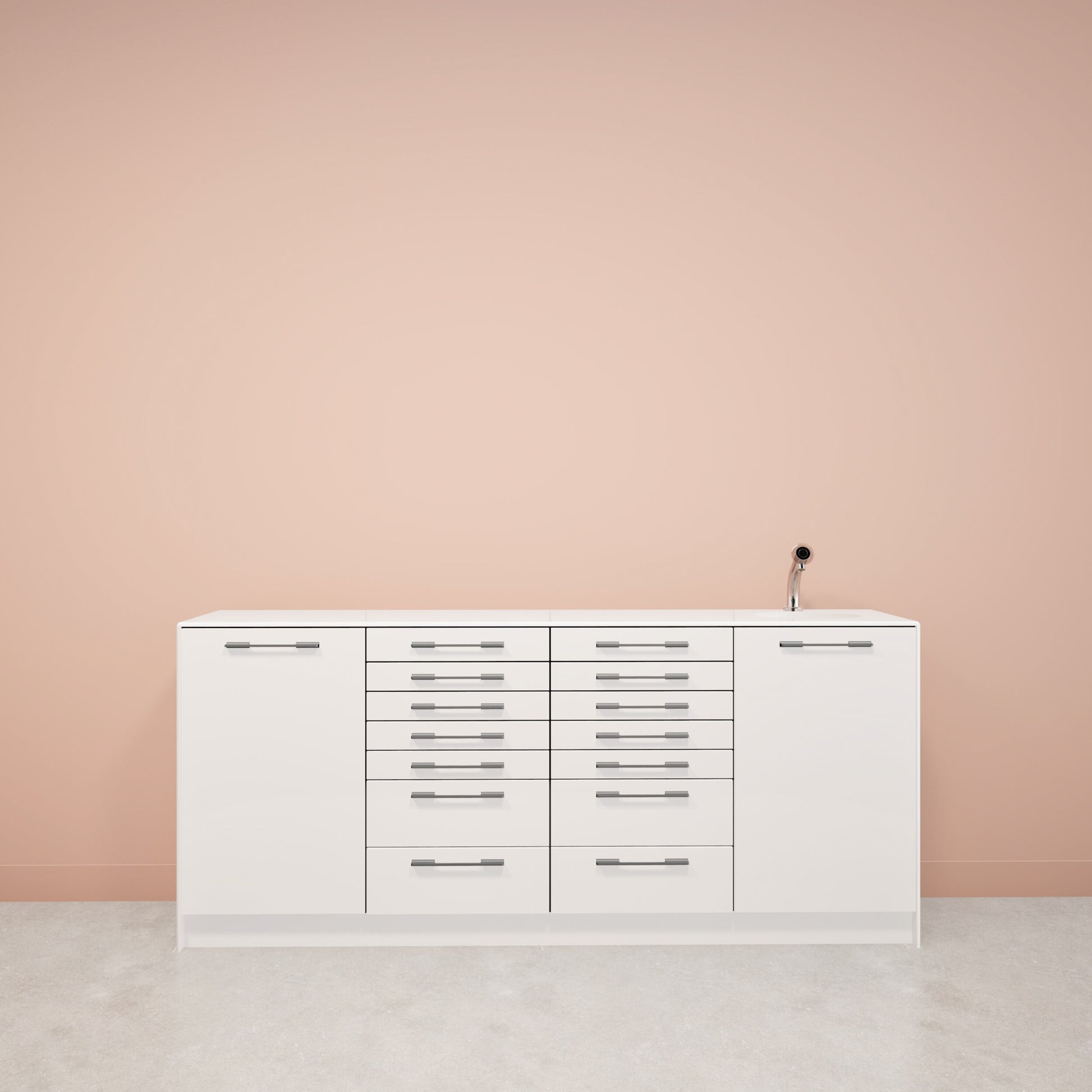 Behandelmeubel gemaakt van Solid Surface. De uittrekplateaus zijn gemaakt van een speciaal ontwikkelde geschuimde PVC voor de mondzorg, welke is voorzien van een uitsparing ten behoeve van de inzetbakken/ inserts.