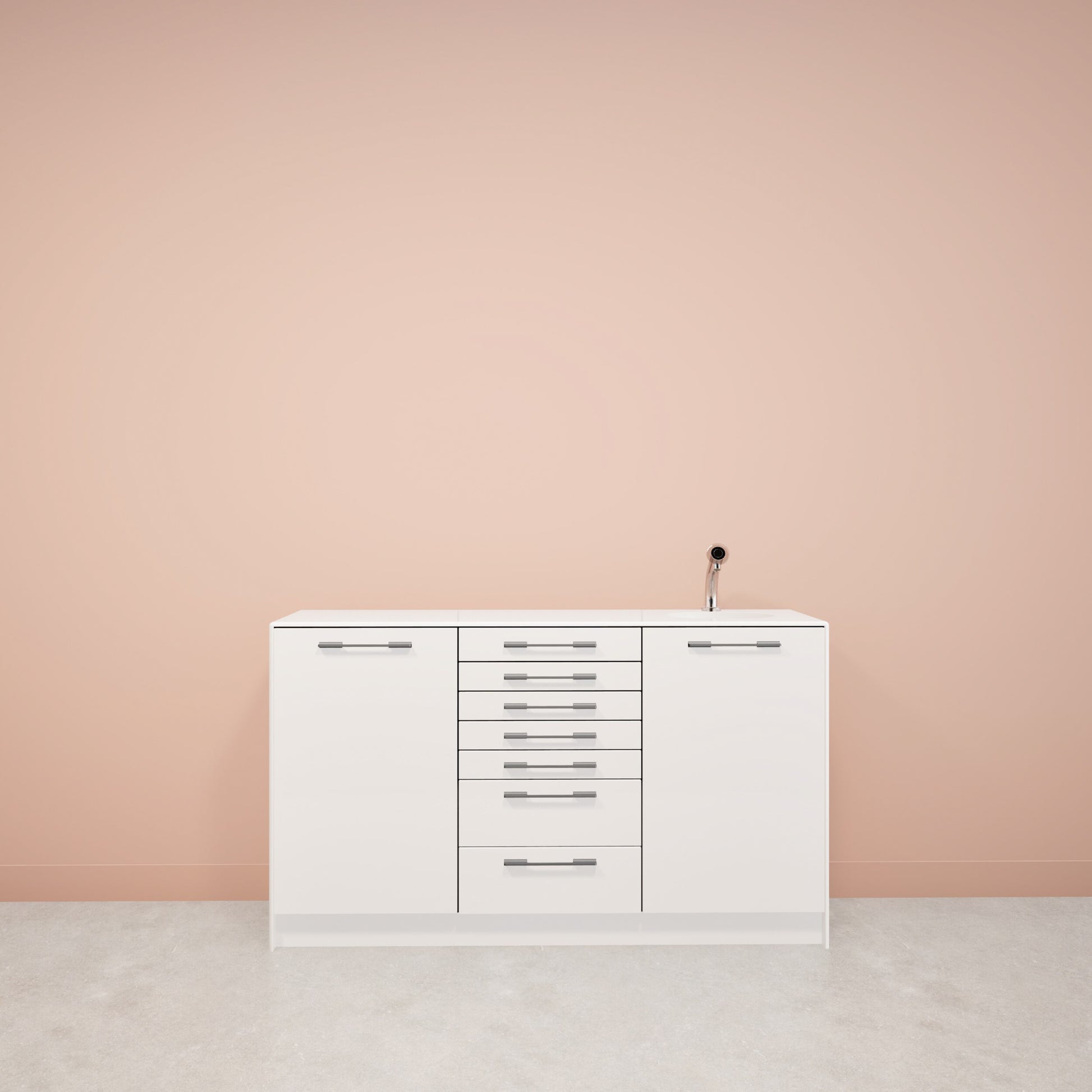 Behandelmeubel gemaakt van Solid Surface. De uittrekplateaus zijn gemaakt van een speciaal ontwikkelde geschuimde PVC voor de mondzorg, welke is voorzien van een uitsparing ten behoeve van de inzetbakken/ inserts.