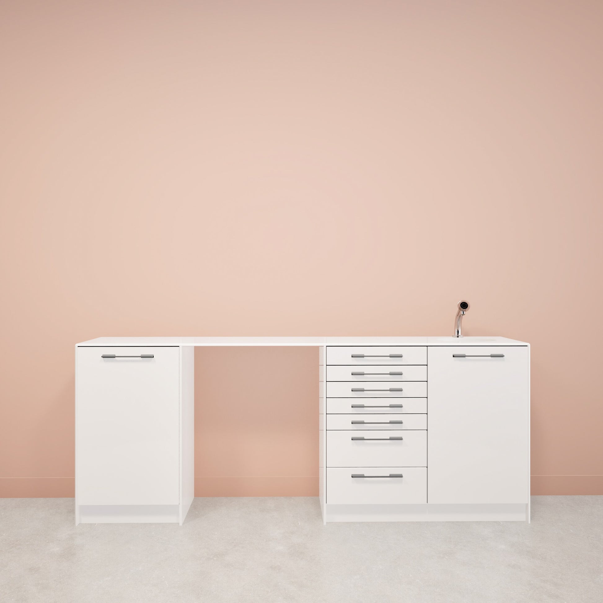 Behandelmeubel gemaakt vanSolid Surface. De uittrekplateaus zijn gemaakt van een speciaal ontwikkelde geschuimde PVC voor de mondzorg, welke is voorzien van een uitsparing ten behoeve van de inzetbakken/ inserts.