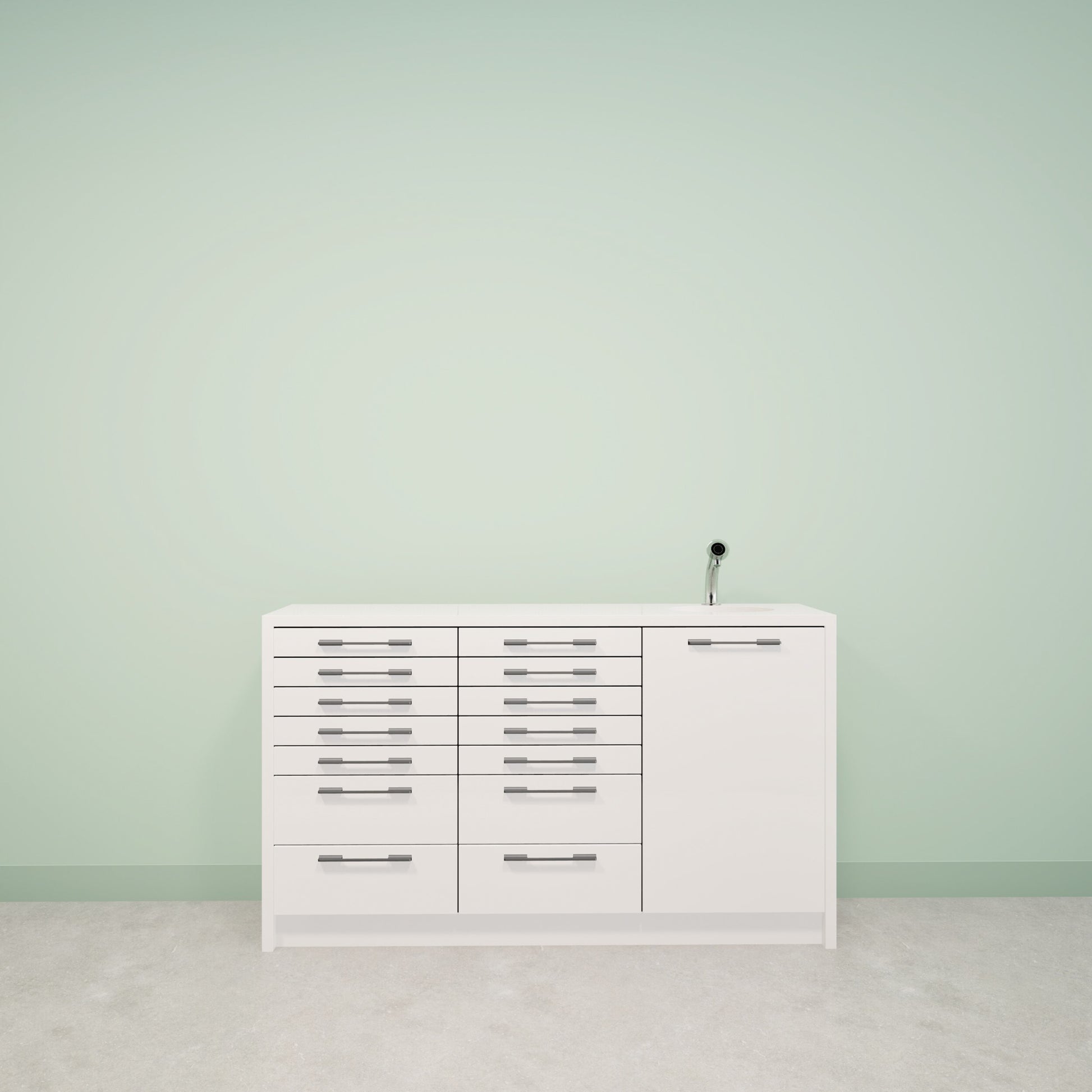 NOVA is a treatment furniture with a sleek 30 mm top and robust side panels, available in both a floating and standing model. The combination of high-quality materials and timeless design makes the NOVA a sustainable and practical choice for any practice. Thanks to the sturdy construction and functional layout, the NOVA offers optimum working comfort and a professional appearance.