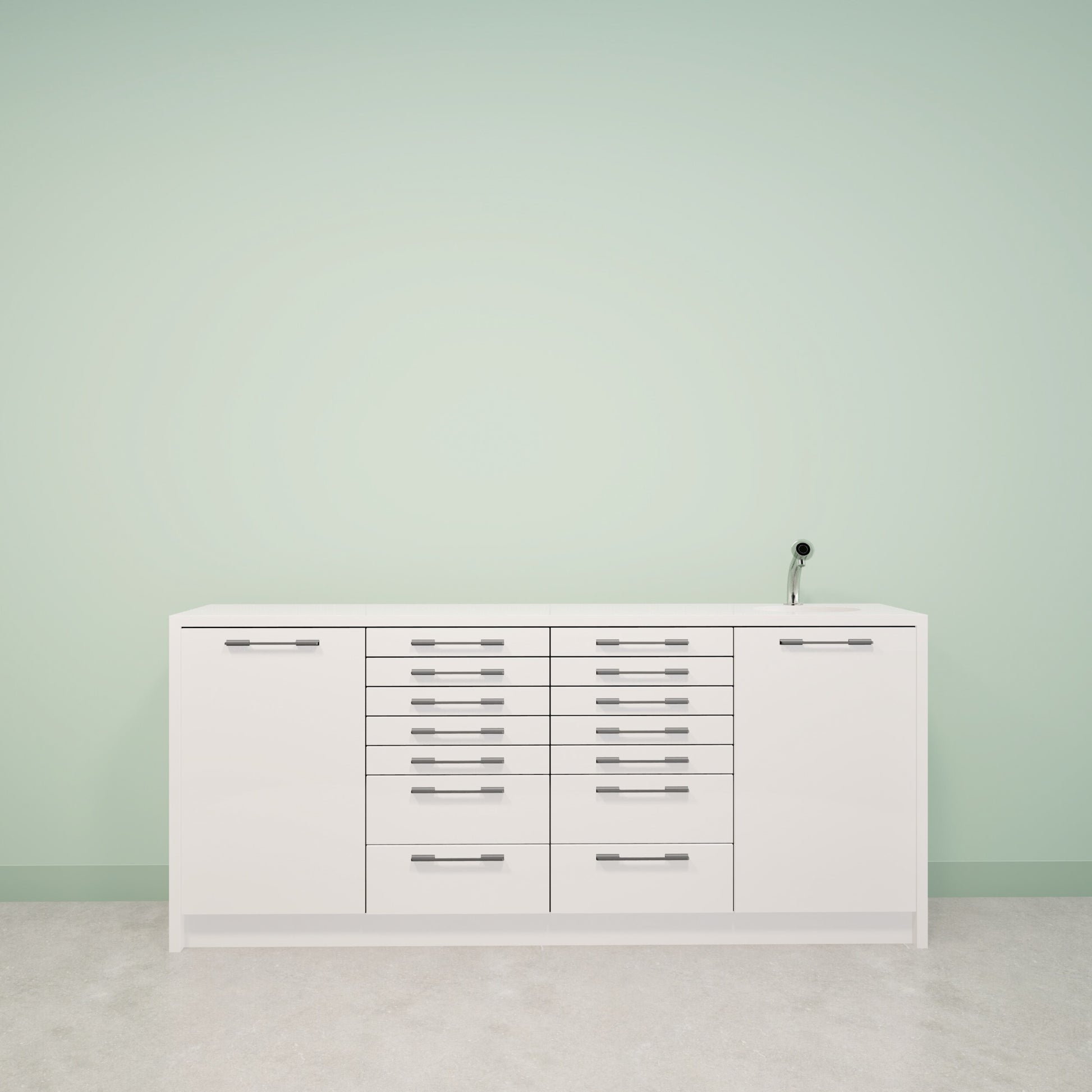 De NOVA L is een modern behandelmeubel met een strak 30 mm werkblad en robuuste zijpanelen, ontworpen voor dagelijks intensief gebruik in tandarts-, mondzorg- of andere medische praktijken. Het meubel is verkrijgbaar in een zwevende of staande uitvoering en combineert een tijdloos design met hoogwaardige materialen. Dankzij de functionele indeling en solide constructie biedt de NOVA L optimaal werkcomfort, veel opbergruimte en een professionele uitstraling in elke behandelruimte.